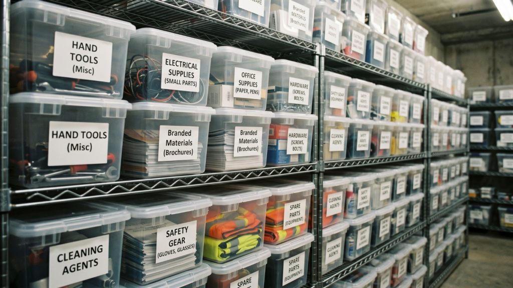 Start by grouping similar items together. Keep tools in one section, inventory in another, and office or marketing supplies in their own clearly marked area. Label bins and boxes so you can find what you need quickly. If possible, use shelving to take advantage of vertical space and avoid stacking everything on the floor.